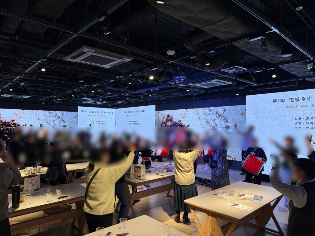 泡盛とともに、三線とエイサーの音色が会場一色に彩り、会場を盛り上げます。