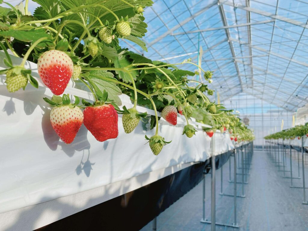 ・ビニールハウスで天候に左右されずイチゴ狩り可